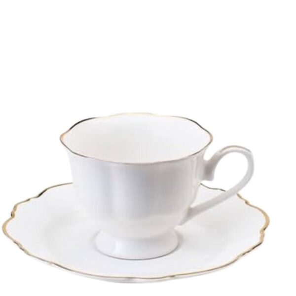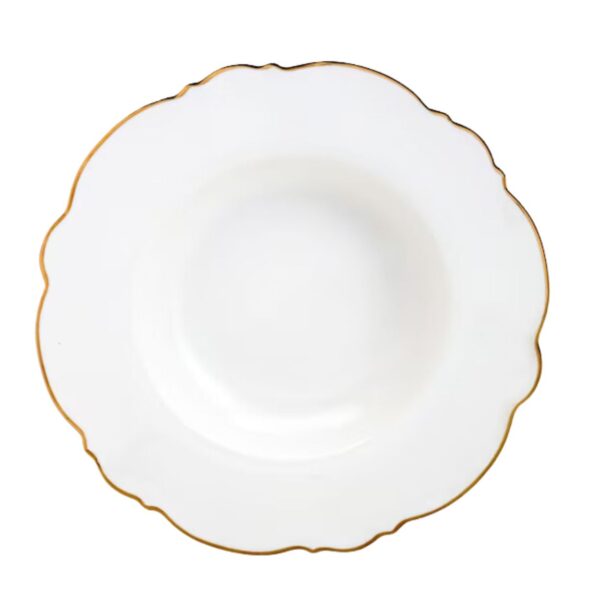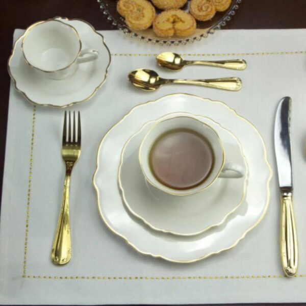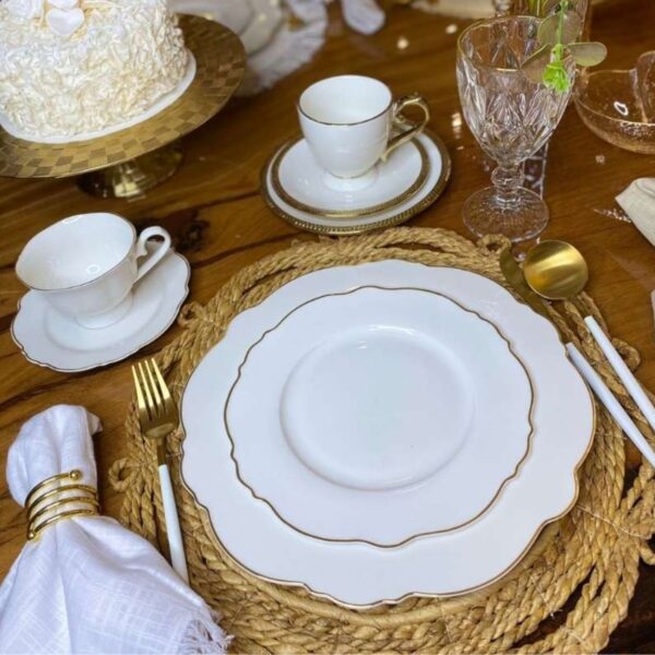 Cada peça é meticulosamente elaborada em porcelana fina, conhecida pela sua durabilidade e brilho incomparáveis. O toque especial fica por conta do filete dourado que adorna cada item, conferindo um brilho sutil e uma aura de luxo que eleva qualquer refeição a uma celebração.
