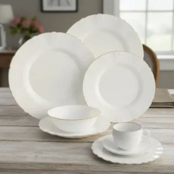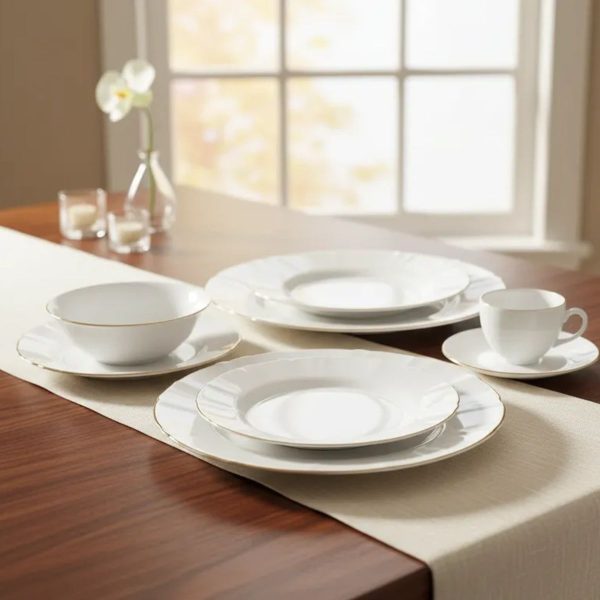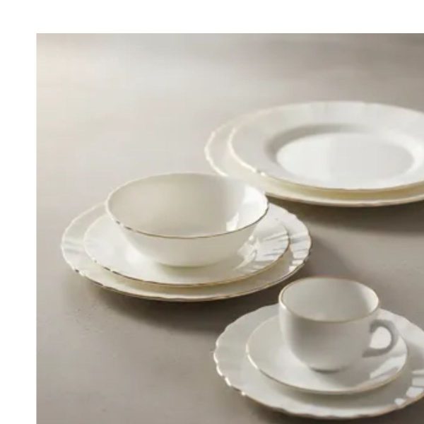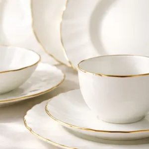 Produzido em opalino de alta qualidade, com delicado fio de ouro, este conjunto une elegância, resistência e funcionalidade, elevando o nível da sua mesa posta.