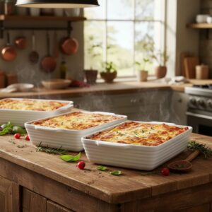 Composicao. 01 Travessa Assadeira Refrataria 29,5×20,5×5,5cm, 01 Travessa Assadeira Refrataria 25,5×16,5×5,0cm,01 Travessa Assadeira Refrataria 20,00×15,00×5,00cm.