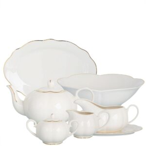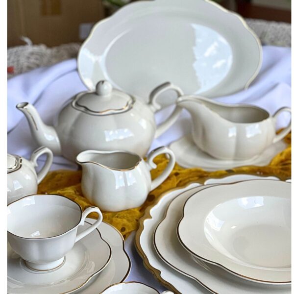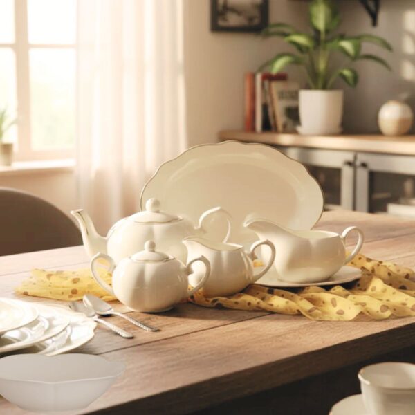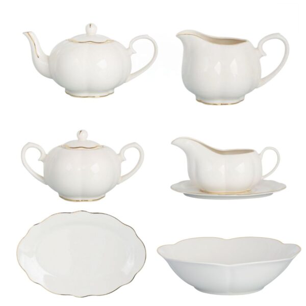 O conjunto apresenta um acabamento refinado com detalhes em dourado, contrastando com o branco clássico da porcelana New Bone China. As bordas suaves e os contornos elegantes das peças trazem um toque de requinte, transformando qualquer refeição em uma experiência luxuosa