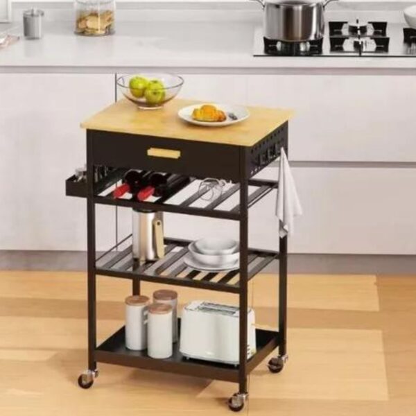 Carrinho fabricado com toda estrutura em metal, conta com 1 bandeja inferior e duas prateleiras superiores que podem ser usada para utensilios ou como adega. Tambem possui uma gaveta para maior comodidade e praticidade.