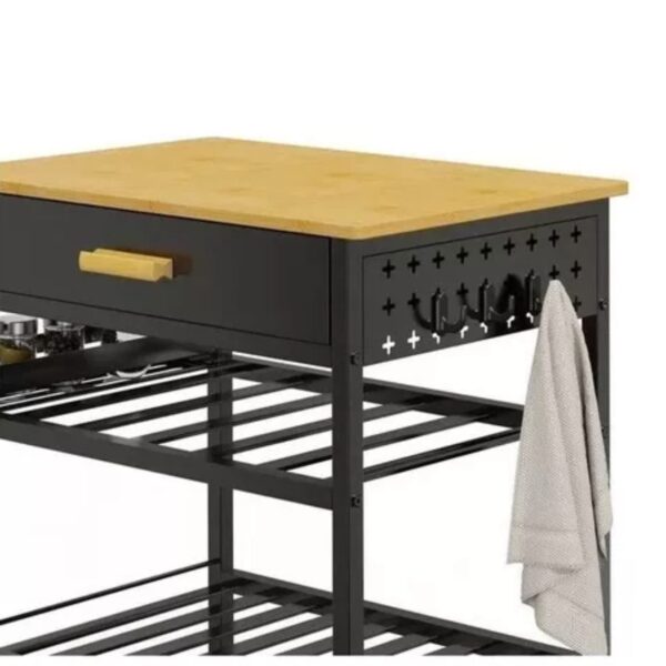 Possui rodizios para que sua locomoção seja pratica e rapida, assim como ganchos na lateral e porta temperos.