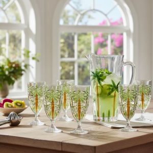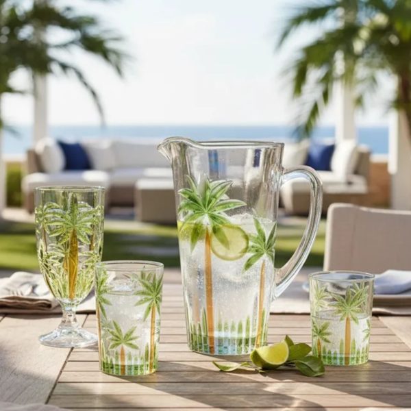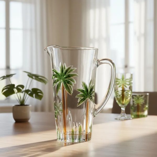 Cada peça apresenta uma palmeira em uma representação artística e detalhada, que evoca a serenidade e a beleza das paisagens tropicais. Os detalhes delicados e a precisão do trabalho manual tornam cada taça, copo e jarra verdadeiramente única, agregando um toque de arte à sua mesa.