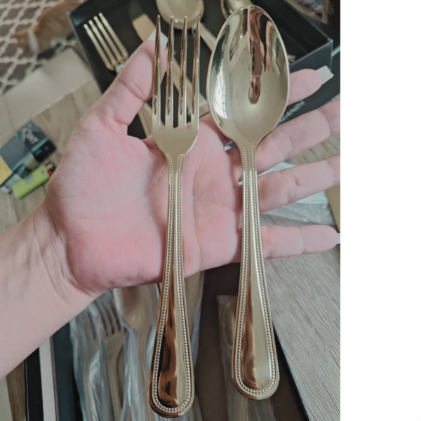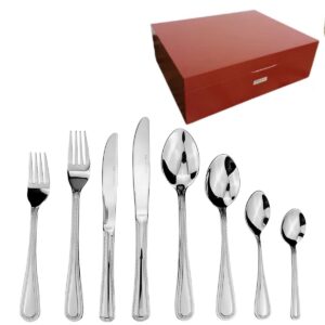Composição: 12 Garfos de Mesa, 12 Facas de Mesa, 12 Colheres de Mesa, 12 Garfos de Sobremesa, 12 Facas de Sobremesa, 12 Colheres de sobremesa,12 Colheres de Chá, 12 Colheres de Cafe, 01 Concha, 01 Colher de Salada,01 Garfo de Salada,01 Colher de Arroz, 01 Pá para Bolo.