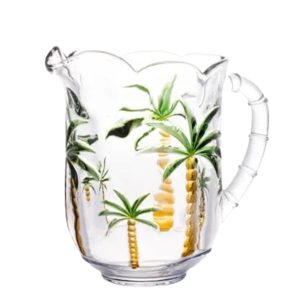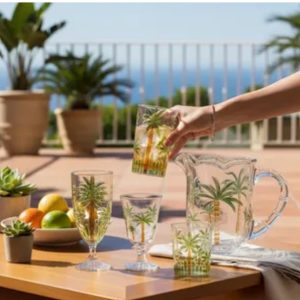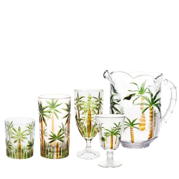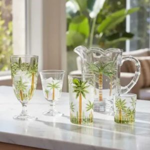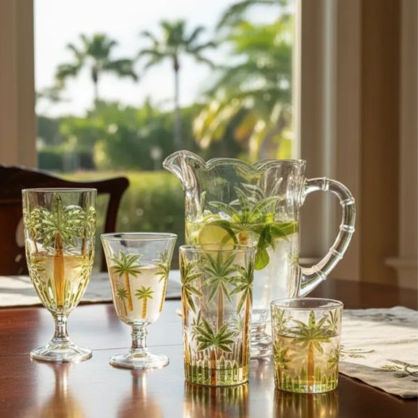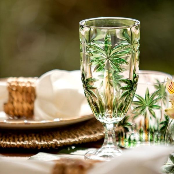 Cada peça apresenta uma palmeira em uma representação artística e detalhada, que evoca a serenidade e a beleza das paisagens tropicais. Os detalhes delicados e a precisão do trabalho manual tornam cada taça, copo e jarra verdadeiramente única, agregando um toque de arte à sua mesa.