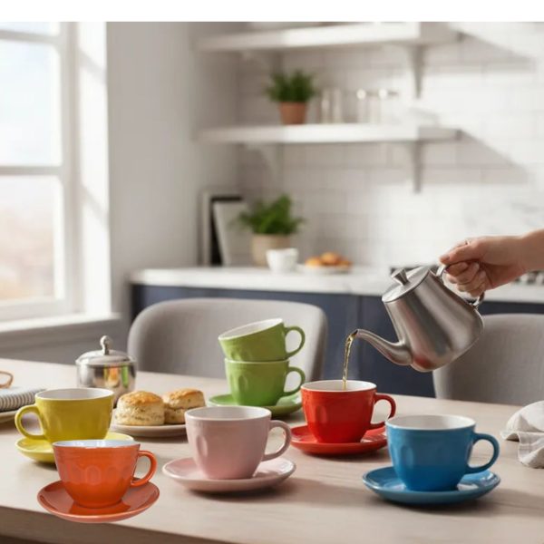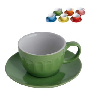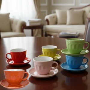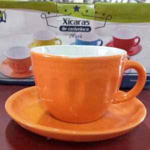 Composição: 1un xicara com pires vermelha,1un xicara com pires amarela,1un xicara com pires laranja.,1un xicara com pires verde,1un xicara com pires azul claro,1un xicara com pires rosa.