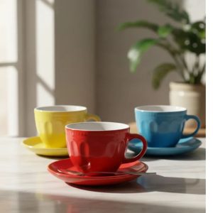 Esse jogo de xícaras possui design clean, cores lindas e vivas.