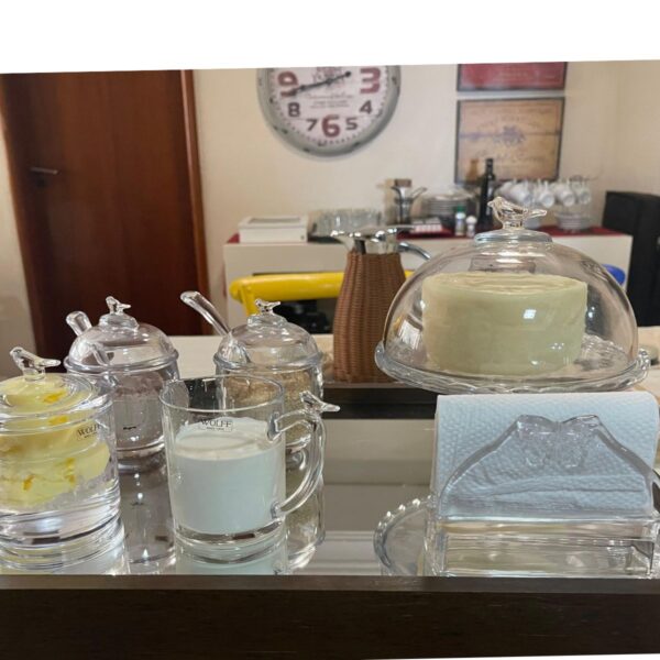 Contém: 6peças sendo: 2un Açucareiro 150ml, 1un Manteigueira 150ml, 1un Porta Guardanapo, 1un Leiteira 250ml, 1un prato com pé para bolo ou queijo com 19cm diametro e 19cm altura.