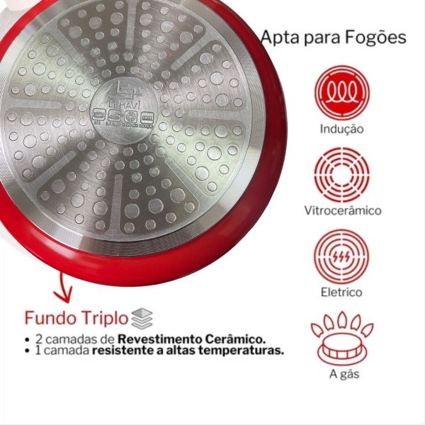 - Em alumínio fundido e revestimento antiaderente de cerâmica, é mais resistente e reduz o uso do óleo nos seus preparos, além da sua tampa pinga gotas que auxilia no uso e na hora de servir.