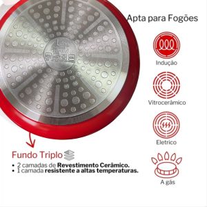 • Em alumínio fundido e revestimento antiaderente de cerâmica, é mais resistente e reduz o uso do óleo nos seus preparos, além da sua tampa pinga gotas que auxilia no uso e na hora de servir.