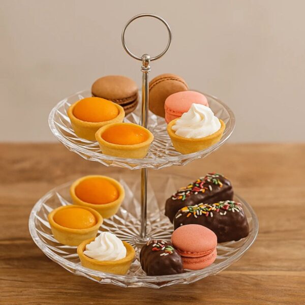 O Prato Duplo de Vidro Decorado para Doces,Salgados,Bolos, Frutas é perfeito para adicionar elegância à sua mesa posta para cafe e lanche. Com dois níveis, você pode exibir uma variedade de doces de forma organizada e sofisticada. Este prato é novo e de alta qualidade,garantimos durabilidade e estilo para suas ocasiões especiais. Adquira já o seu e encante seus convidados com uma apresentação impecável.