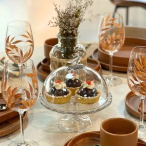 O detalhe de borboletas lapidadas no cristal e o pé elevado conferem um visual refinado, ideal para compor mesas elegantes.