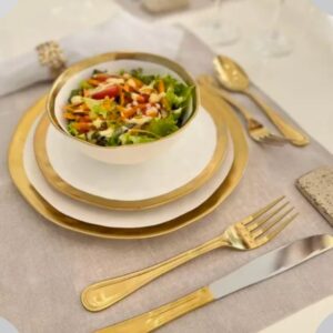 Surpreenda os seus convidados com esta elegante linha Dubai feito de porcelana na cor branca e detalhes em dourado. De linhas clássicas e design requintado, este jogo dará um toque e sofisticação à sua mesa.