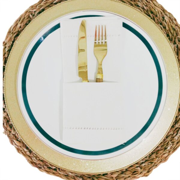 Combinação equilibrada: Para destacar o filete dourado das louças, procure criar um contraste equilibrado com outros elementos da mesa. Opte por uma toalha de mesa de cor neutra, como branco, creme ou cinza claro, para permitir que o dourado se destaque. Evite padrões ou estampas muito chamativas, para não competir com o brilho sutil do filete dourado.