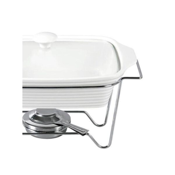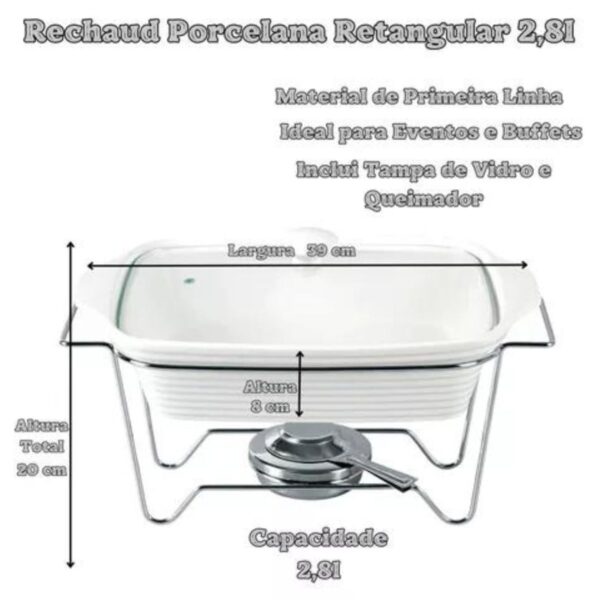 Este conjunto completo é perfeito para quem deseja servir pratos quentes de forma prática e elegante. Feito de porcelana resistente e durável, com tampa de vidro, suporte para a travessa e queimador em aço inox, este réchaud é um item essencial em qualquer evento ou jantar.