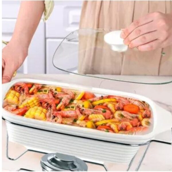 Com espaço suficiente para pratos maiores, como lasanhas, carnes e vegetais assados, este réchaud é perfeito para quem deseja servir pratos quentes sem precisar se preocupar com a temperatura dos alimentos. A tampa de vidro permite visualizar os alimentos sem precisar removê-la, enquanto o suporte para a travessa mantém a travessa estável e segura durante o uso.