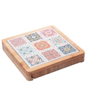 Tábua com acabamento em ladrilho, que une beleza e durabilidade, proporcionando uma superfície ideal para servir e cortar queijos.