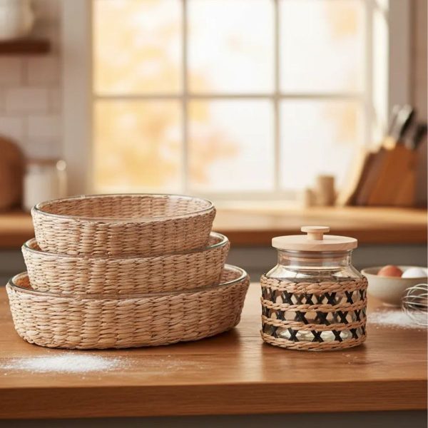 O suporte de rattan é outro elemento que aprimora a funcionalidade do conjunto. Além de servir como uma base estável para as travessas e assadeiras, também adiciona um toque de charme e elegância à apresentação das refeições. O rattan é um material resistente, leve e de fácil manutenção, o que o torna ideal para uso na cozinha.