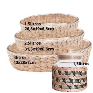 Travessa e Assadeira Refratárias Ovais 4un Vidro com Suporte de Rattan