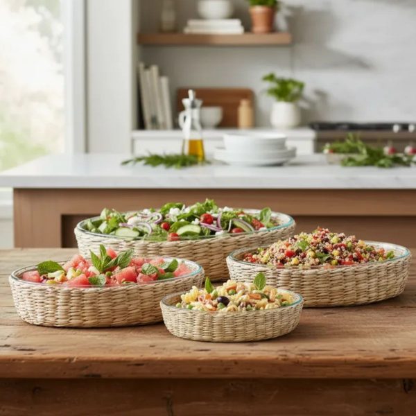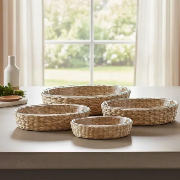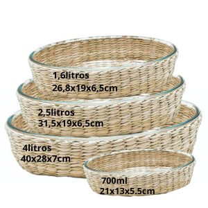 Travessa e Assadeira Refratárias Ovais 4un Vidro com Suporte de Rattan