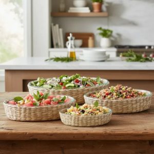 Desde refeições principais até sobremesas, essas travessas juntamente com o suporte de rattan serão aliados essenciais na sua cozinha para impressionar seus convidados ou para desfrutar de pratos deliciosos com sua família.